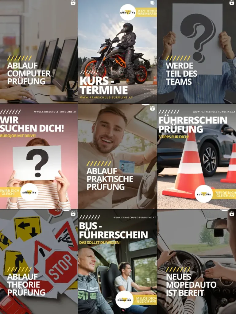 Hier haben wir ein Zeitungsinserat umgesetzt, das durch ästhetisches Design sofort ins Auge fällt und gleichzeitig klar den Verkaufsschwerpunkt kommuniziert.Social Media – Fahrschule Euroline